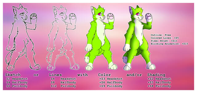 I usually take payment in USD (via PayPal or CashApp) but will also accept DeviantART Points and/or petsite currency/items (FlightRising Treasure/Gems/items, Robux, etc)